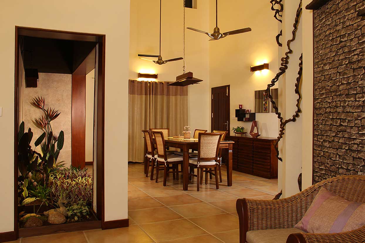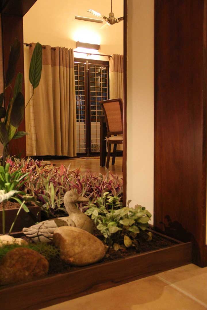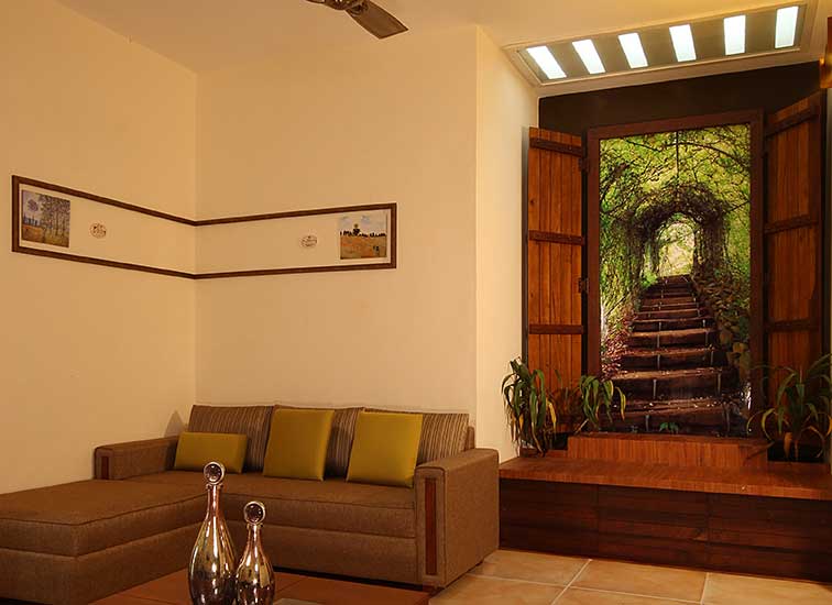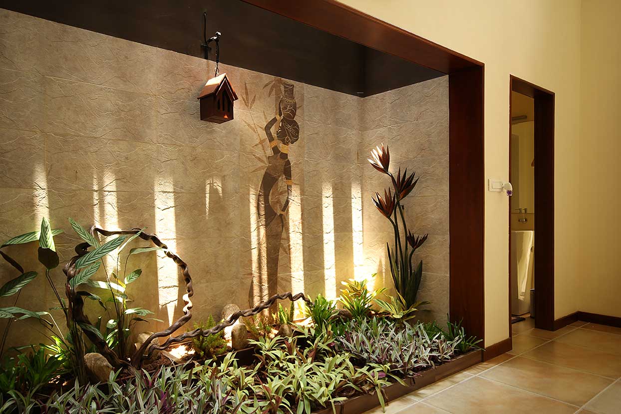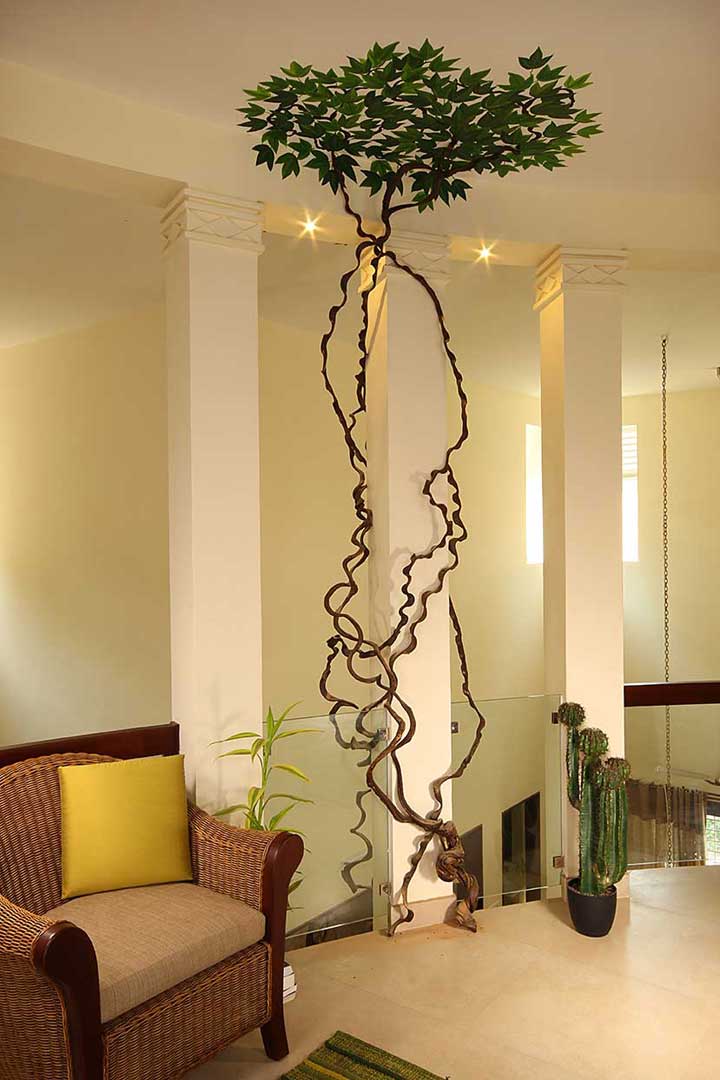 A homely urban cottage expresses its uniqueness in its interiors enriched by natural expressions of art, like a false step-out painting in a family space and a focal structure is a central column embraced by wine shoot vegetation.