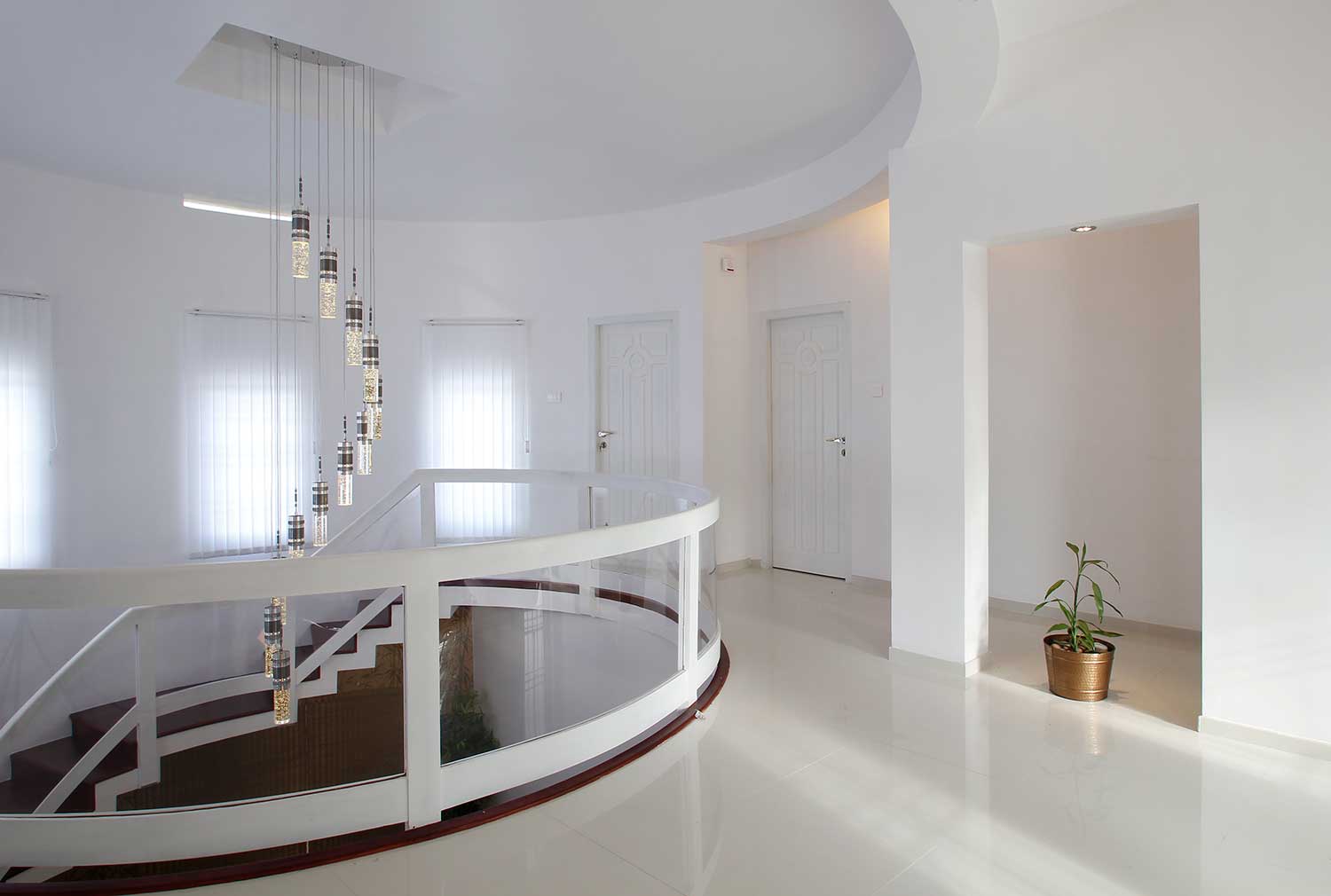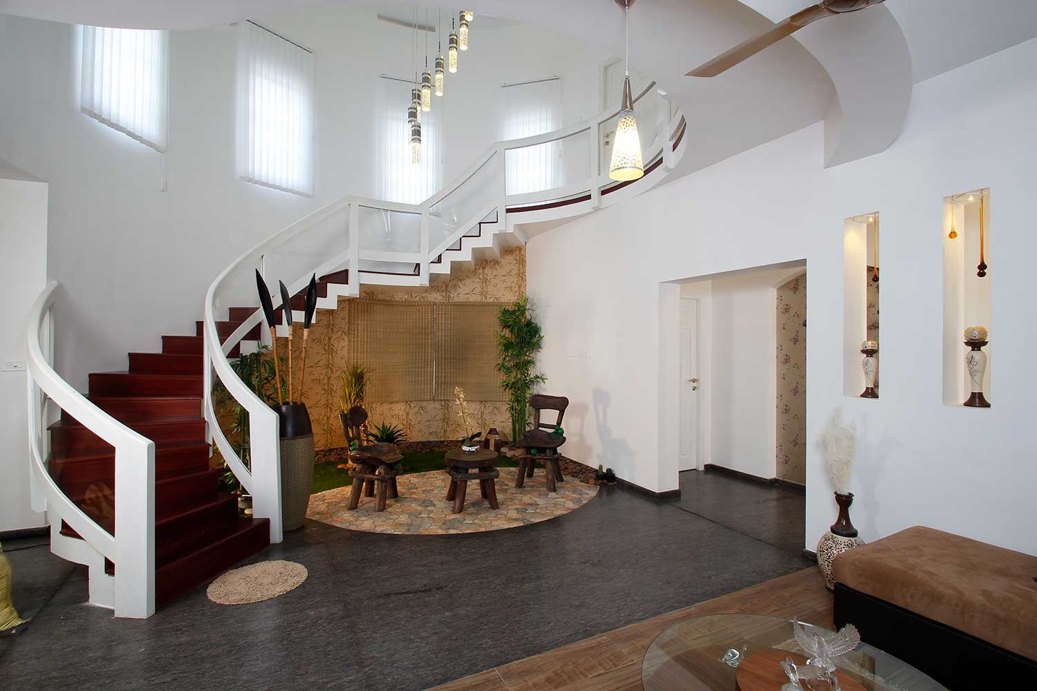 A curvacious landscape drew a challenge for evolving this magnific design structure and a shape based on concentric circles. further the design elements of the elevation beautifully expresses itself in the exterior as laminar flows of curves. Interiors are also well spaced out with embracing feel of nature.